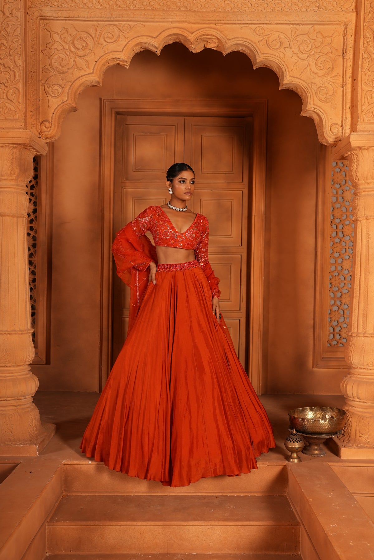 Featuring candy orange lehenga in silk, paired with organza base blouse in tone on tone work in glass beads & sequence, zari embellishments, including organza dupatta. Accentuate it with statement earings and a choker for engagement or as a bridesmaids outfit.