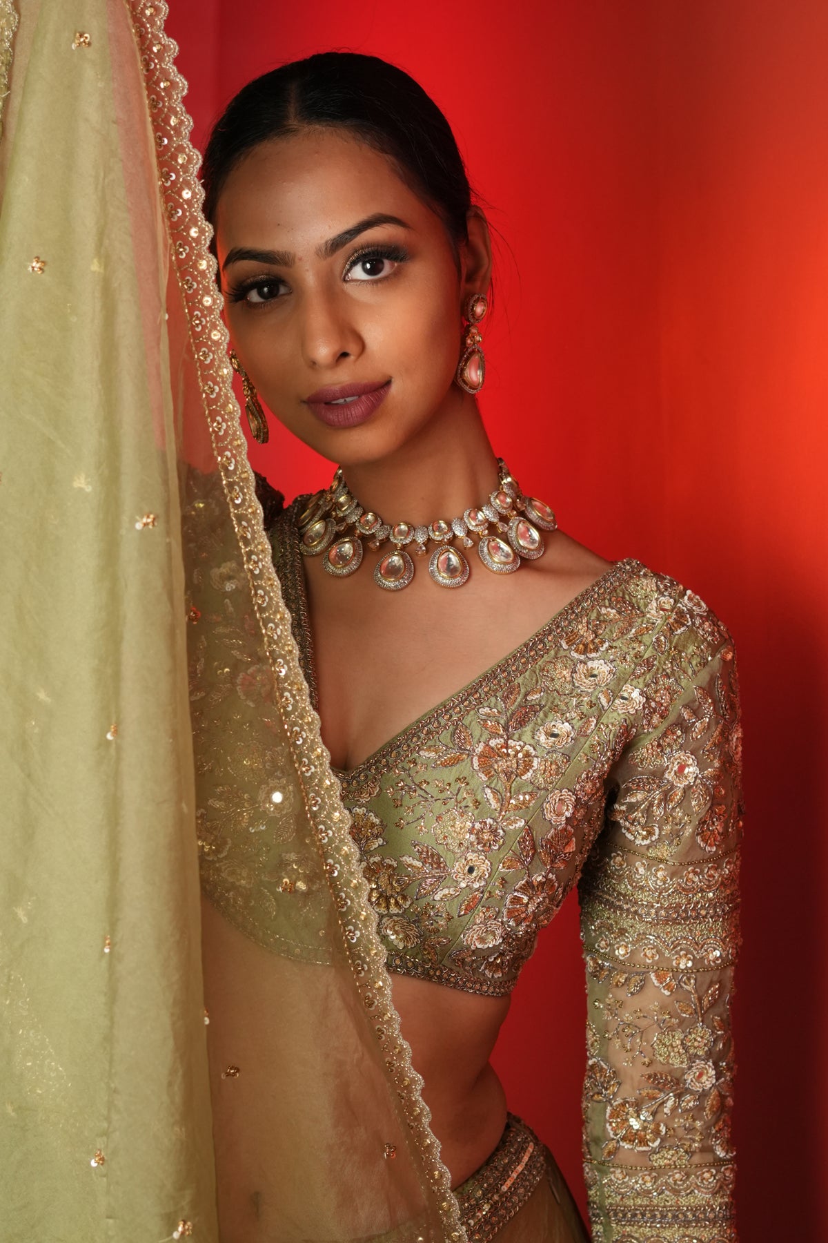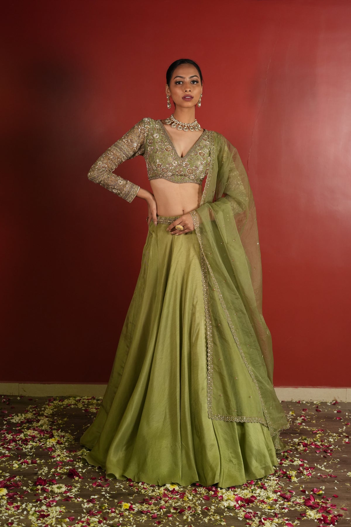 Featuring Green Lehenga With Heavy Embroidered Blouse With Gold & White Cutdana-Sequins, Beads, Zeri, Zardosi, Etc. Paird With Plain Skirt and Organza Duppata.
