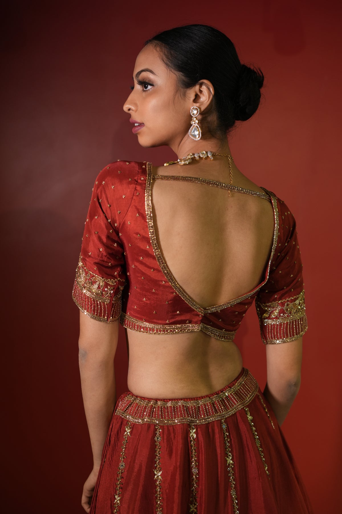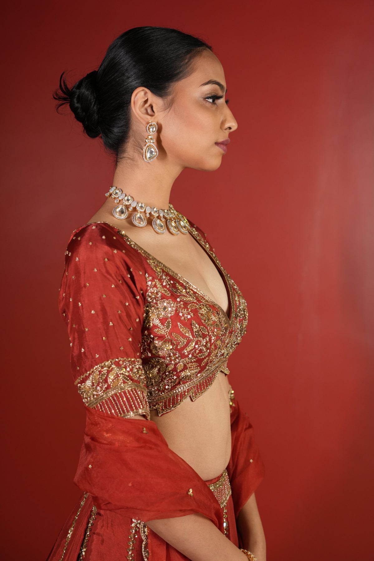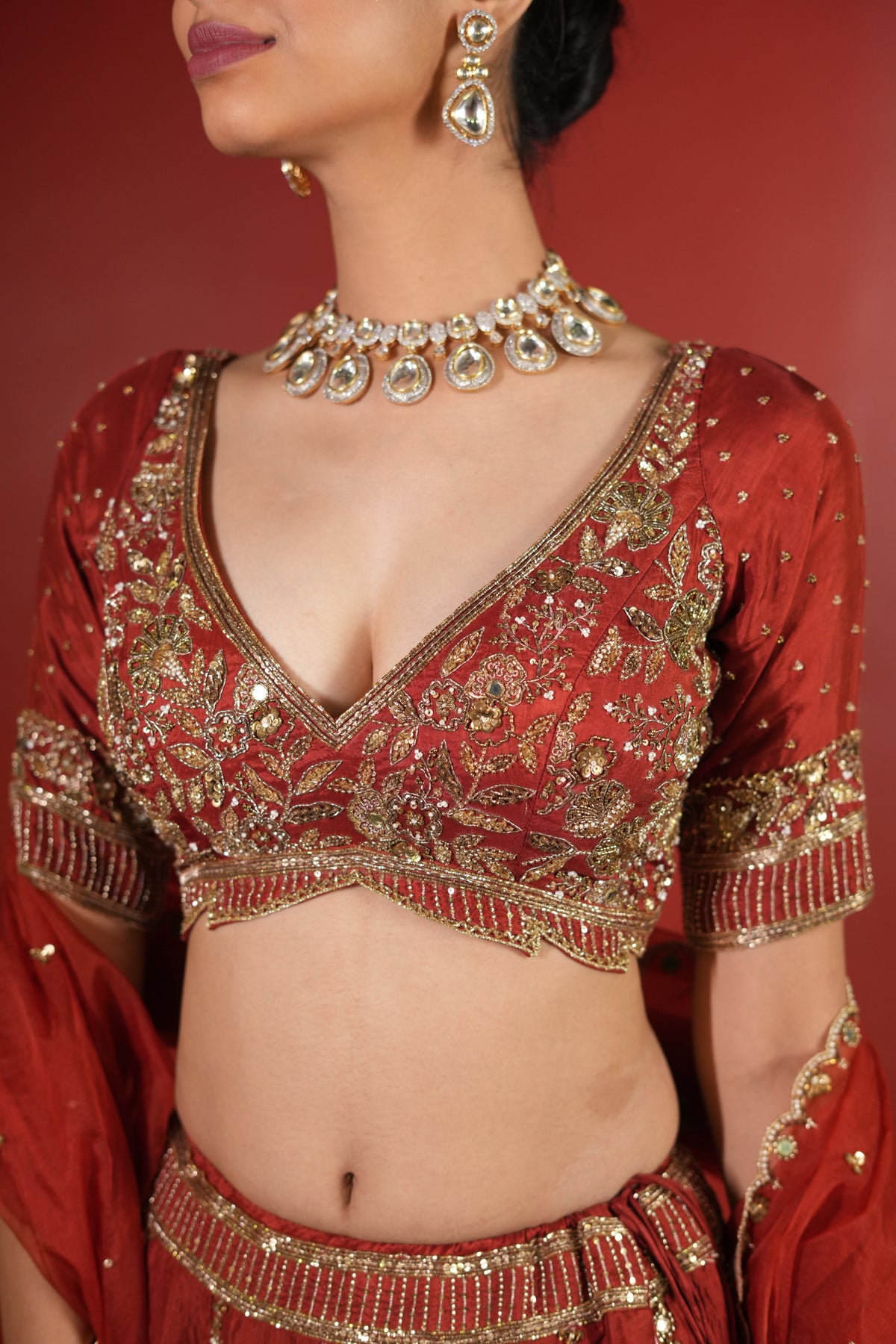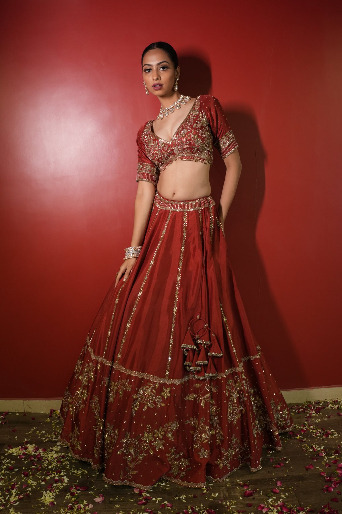 Featuring Maroon Rust Lehenga Embellished With Zardoshi, Cutdana, Pearl, Sequins, Zari. Paird With Matching Blouse And Organza Duppata.