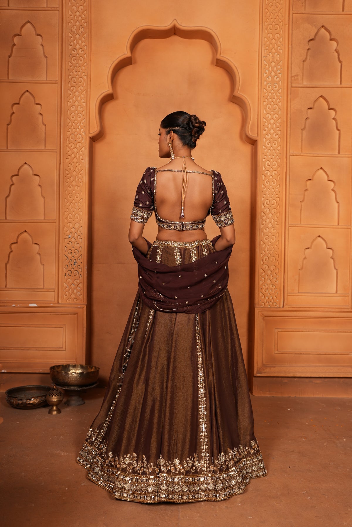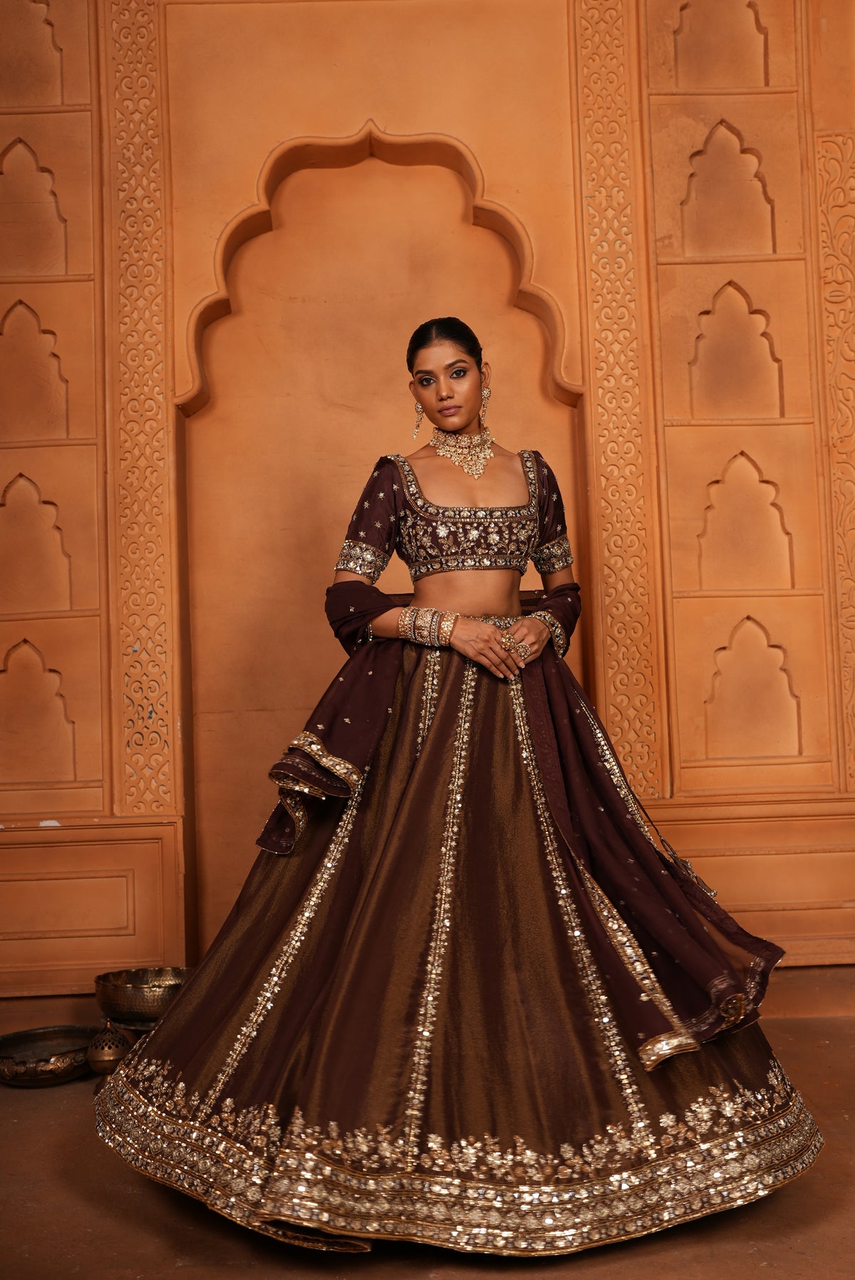 Featuring enchanting deep maroonish brown zari lehenga embellished in gold work in zari, sequence, glass beads detail, it is paired with heavy embellished blouse and embroidered dupatta
