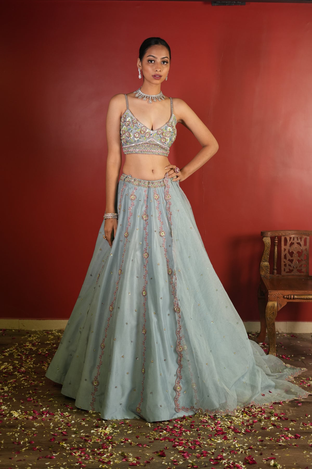 Featuring Sky Blue Lehenga Embroidered With Colourfull Work(Cutdana, Sequins, Beads,Etc.)And Some Embosed Flower. Matching With Blouse And Organza Duppata.