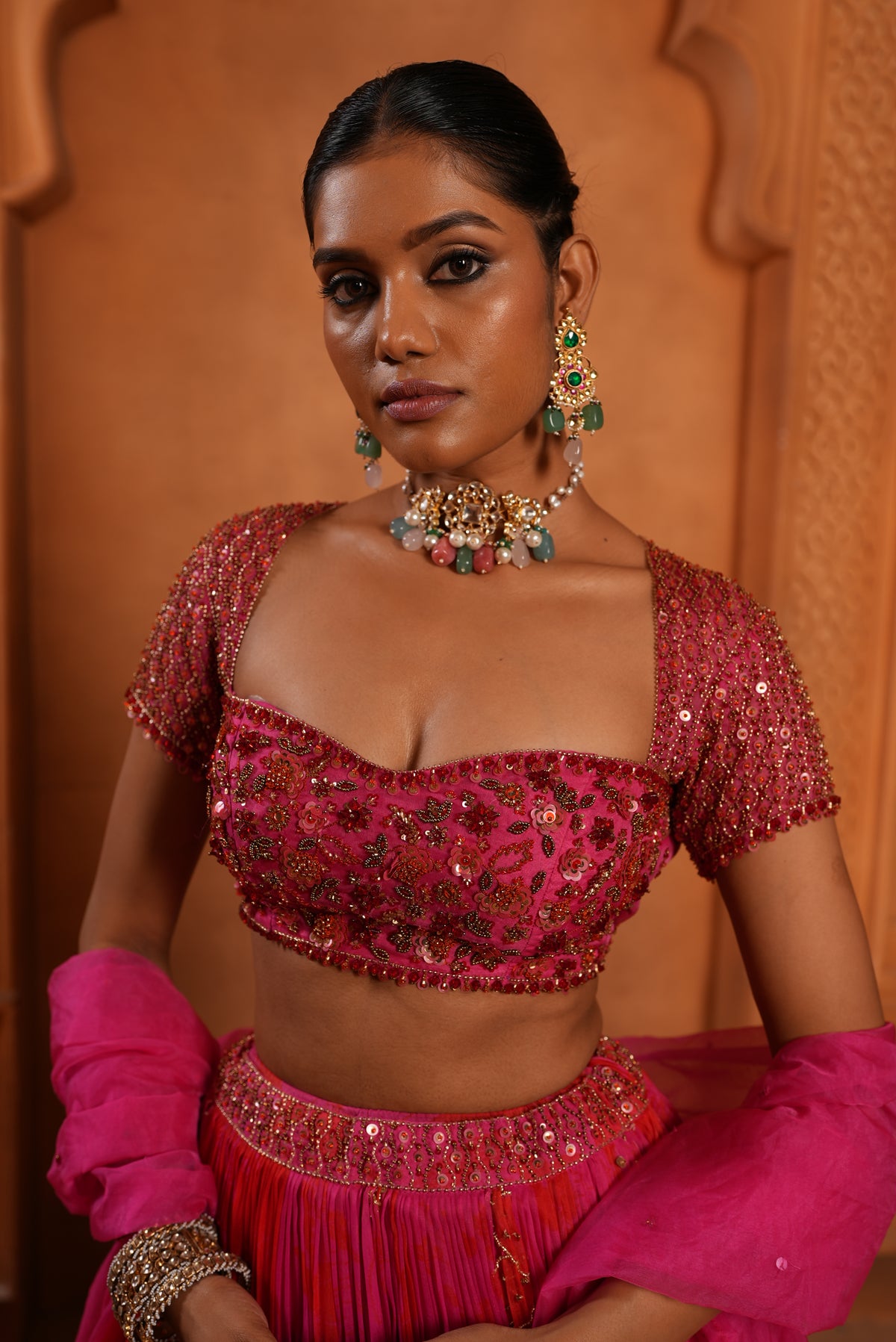 featurimg red and pink printed lehehnga in organza base. It is paired with pink colour blouse in glass beads, sequence embroidery and aa matching dupatta