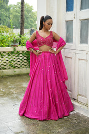 Featuring Hot pink lehenga embroidered in tone on tone work ( sequence, cutdana, beads). Paired with matching blouse and dupatta